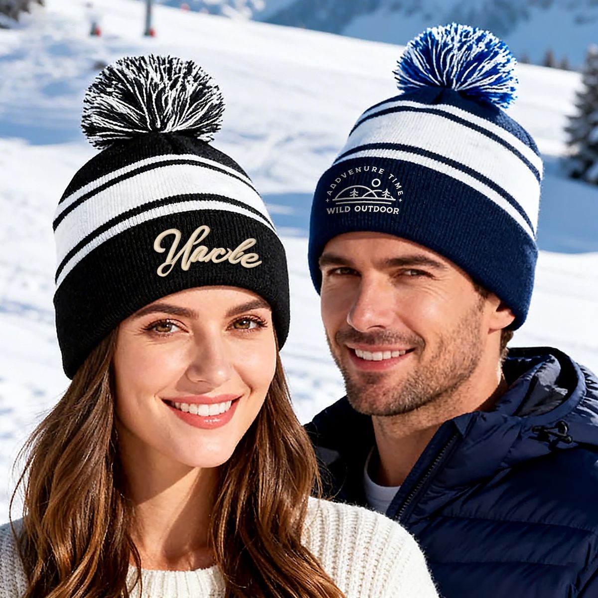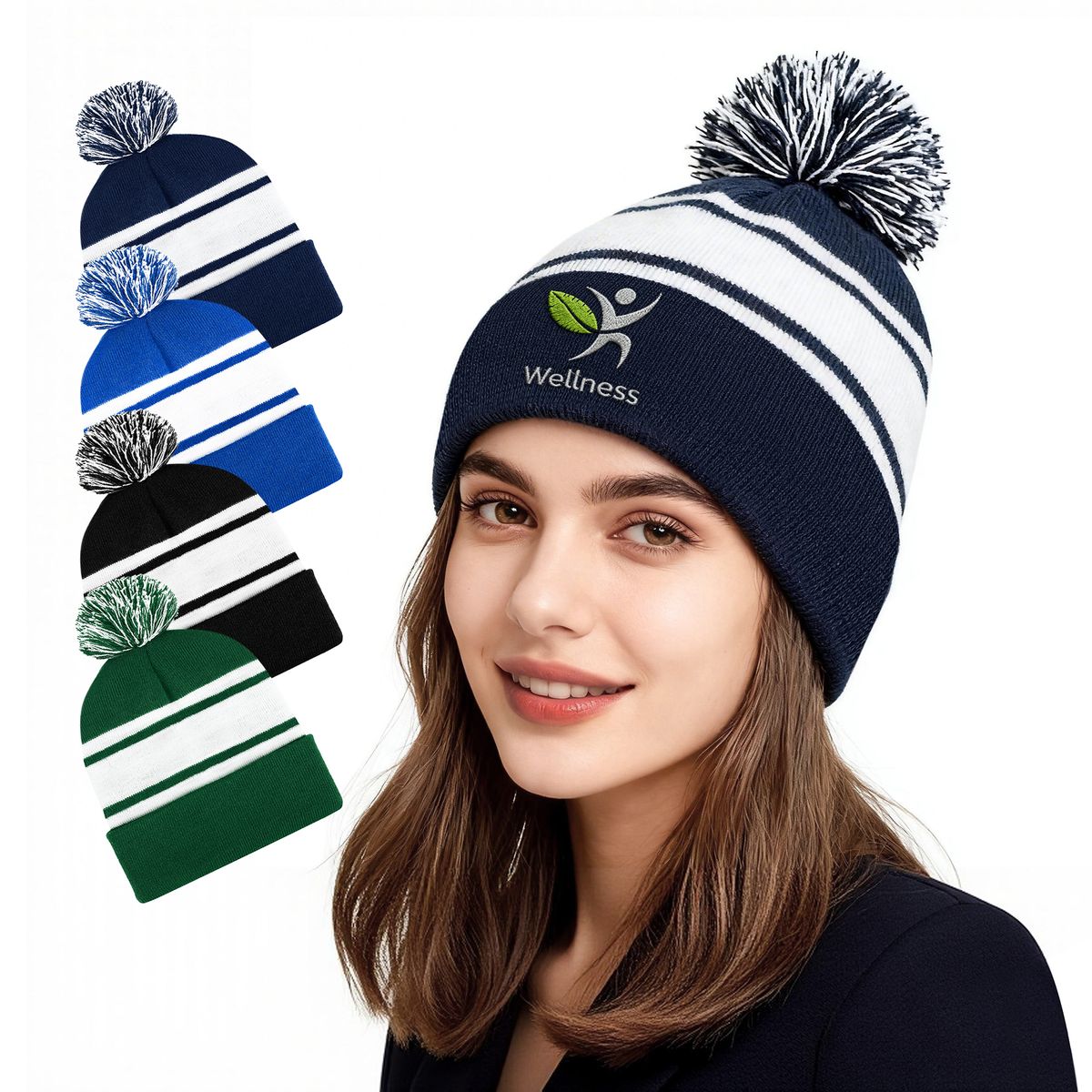 These striped pom beanies are ideal for showcasing your brand stylishly year-round, from sports events to chilly weather. They not only attract attention but also serve practical purposes, enhancing visibility and boosting your marketing efforts. Customize them with your text, logo, or artwork in a prominent imprint area for maximum impact. Custom beanie colors are available.